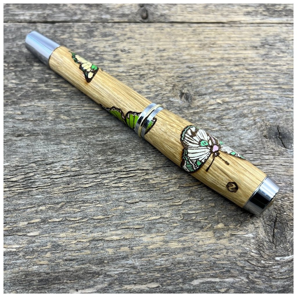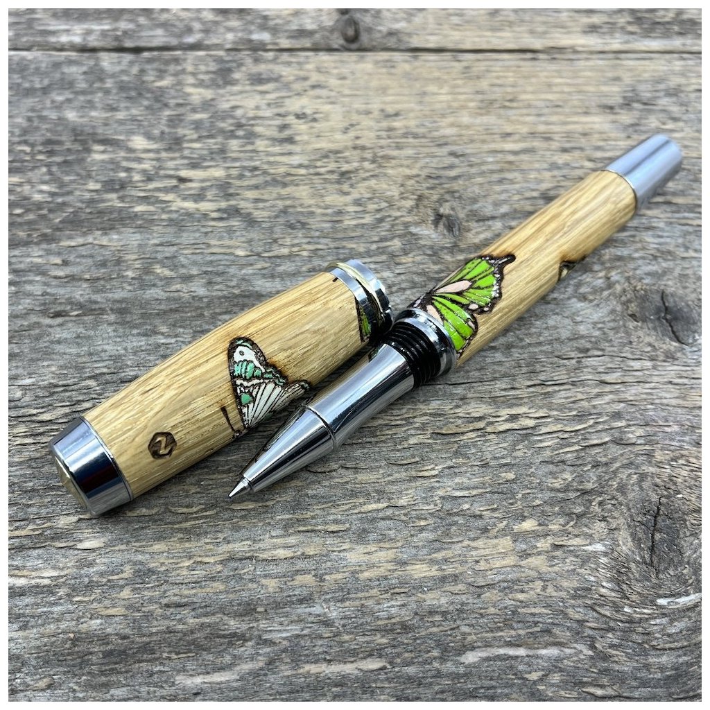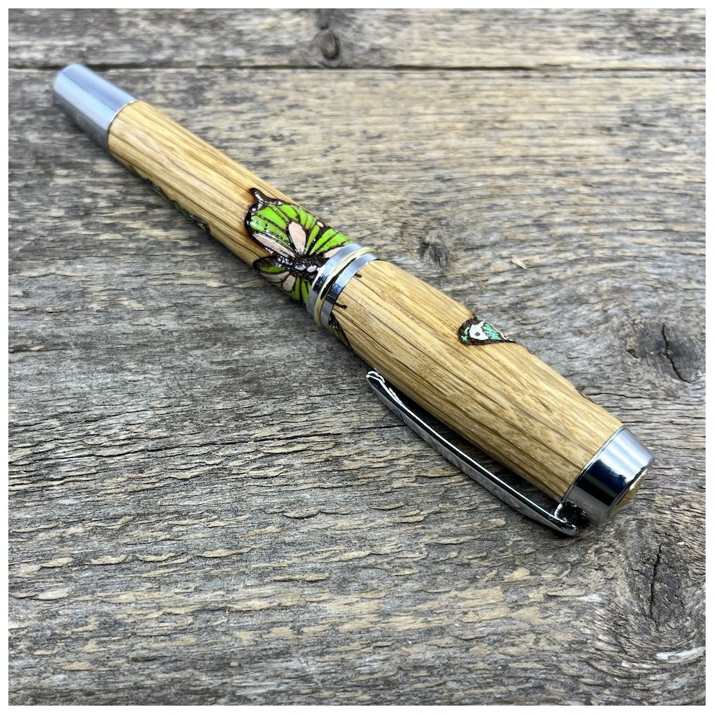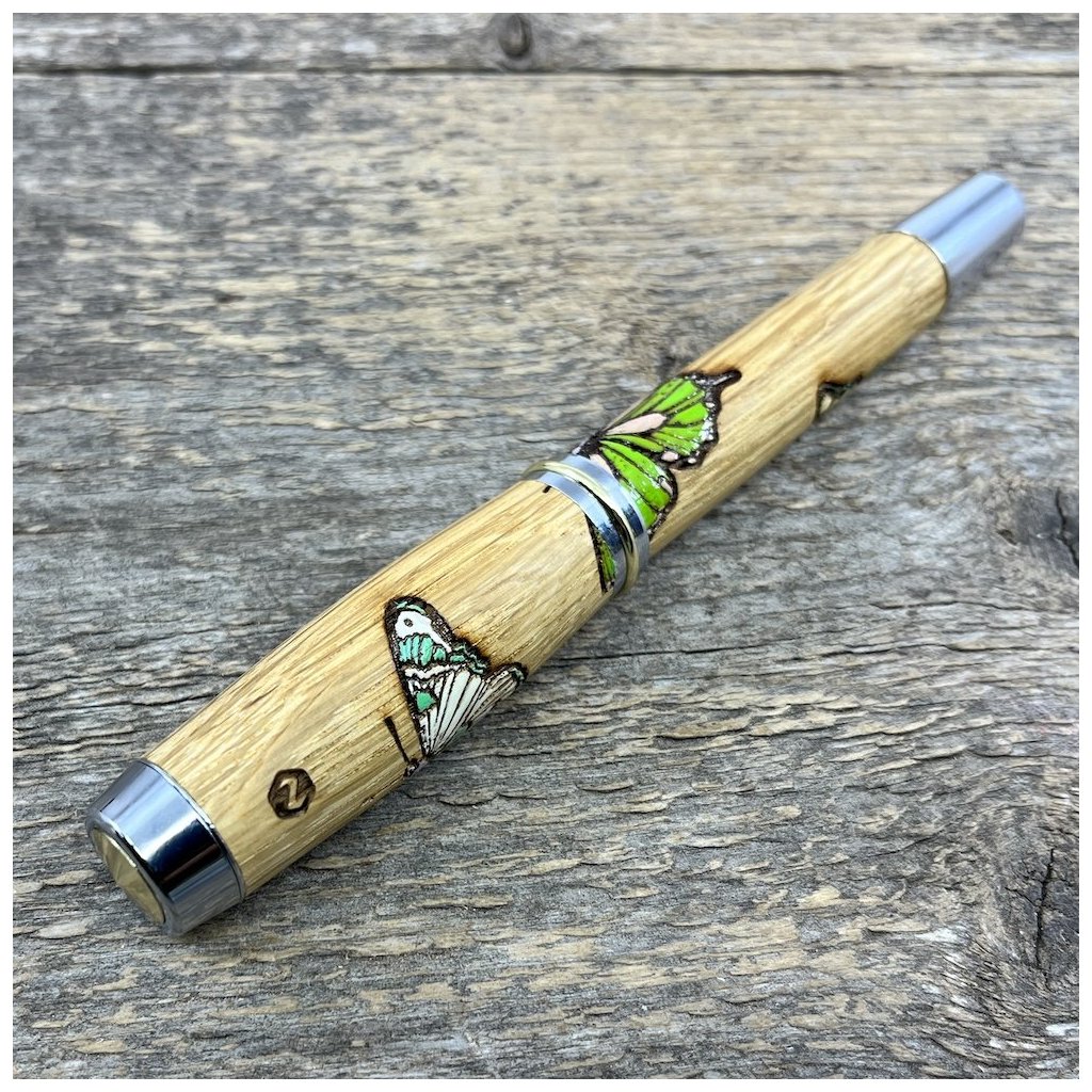 Kuličkové pero Portland L z českého dubu jsem vytvořil pro větší ruce nebo pro milovníky těžších a mohutnějších psacích per.Tentokrát jsem ho doplnil ručně barvenými motýlky, kteří jsou překryti vrstvou bezbarvého laku aby hezky vydrželi.