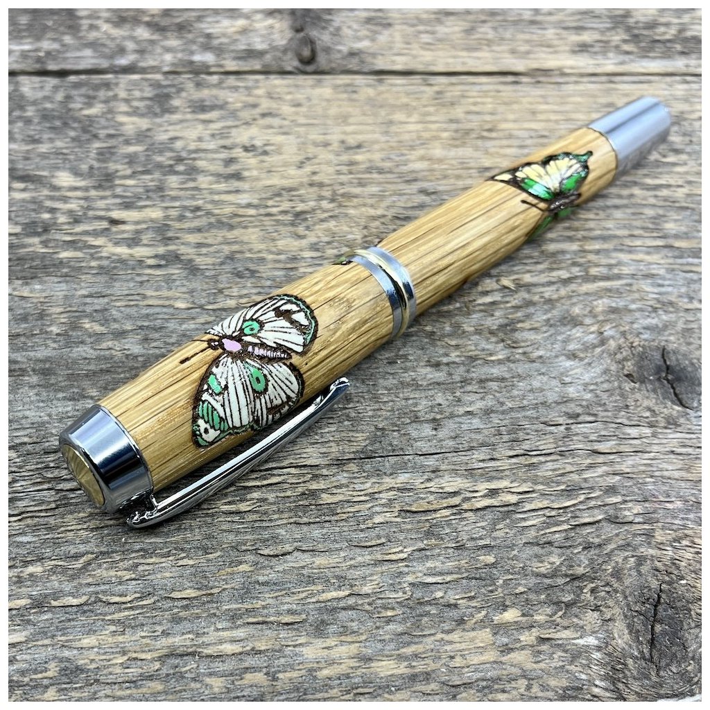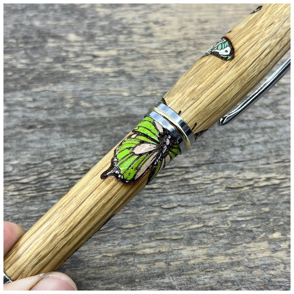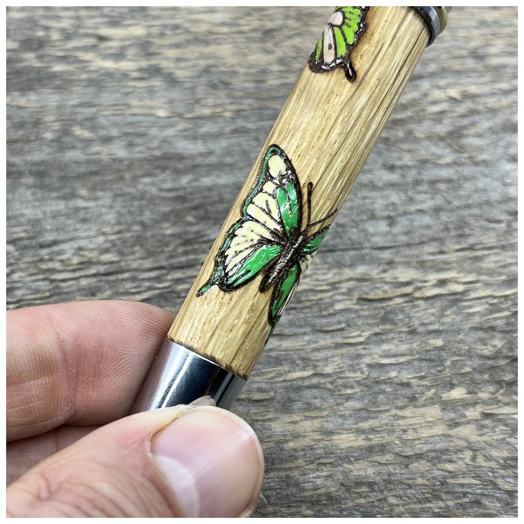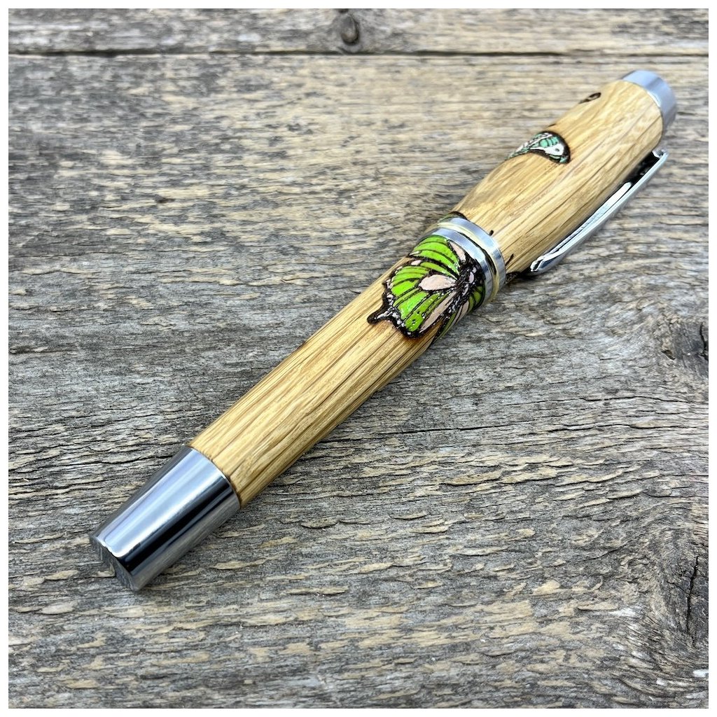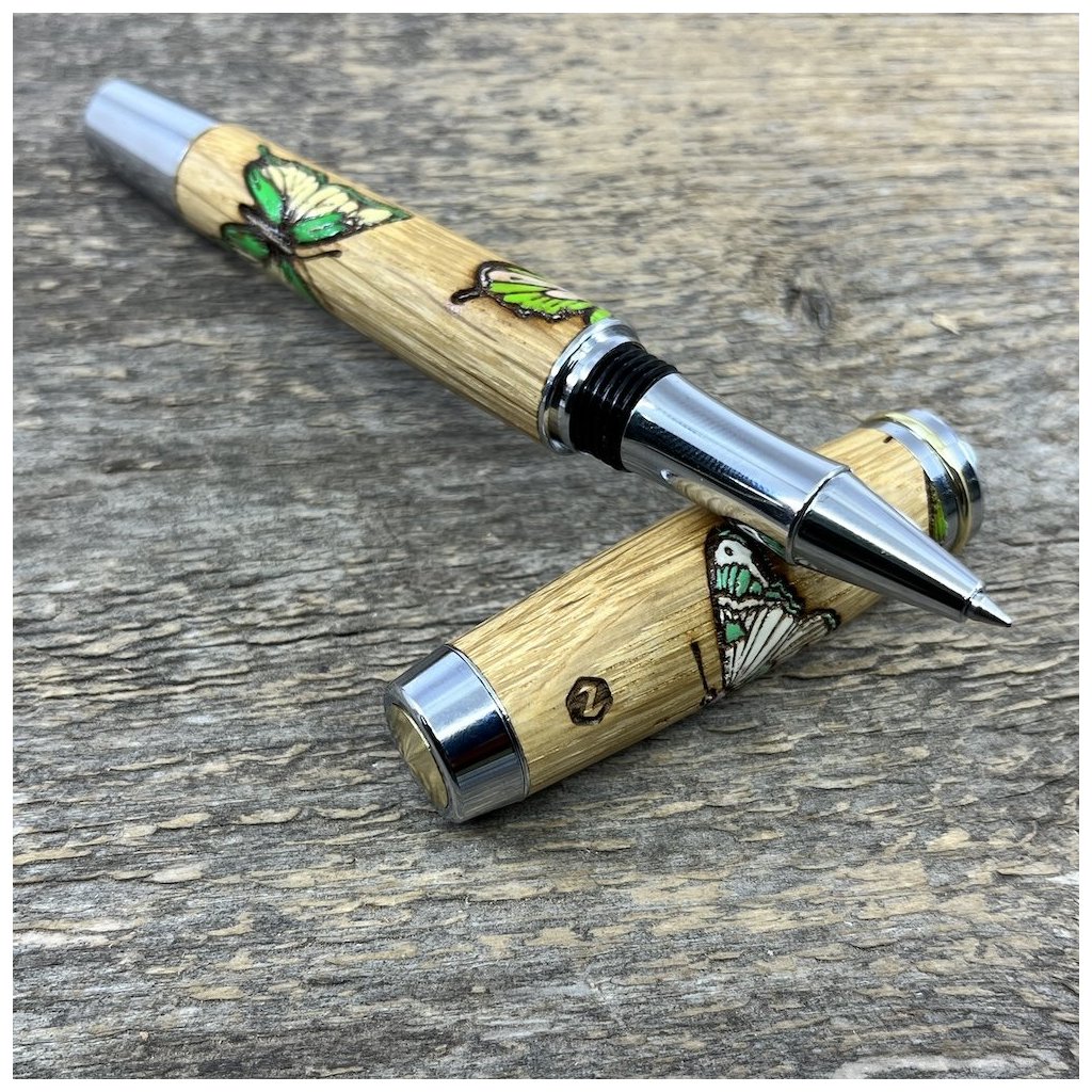 Kuličkové pero Portland L z českého dubu jsem vytvořil pro větší ruce nebo pro milovníky těžších a mohutnějších psacích per.Tentokrát jsem ho doplnil ručně barvenými motýlky, kteří jsou překryti vrstvou bezbarvého laku aby hezky vydrželi.