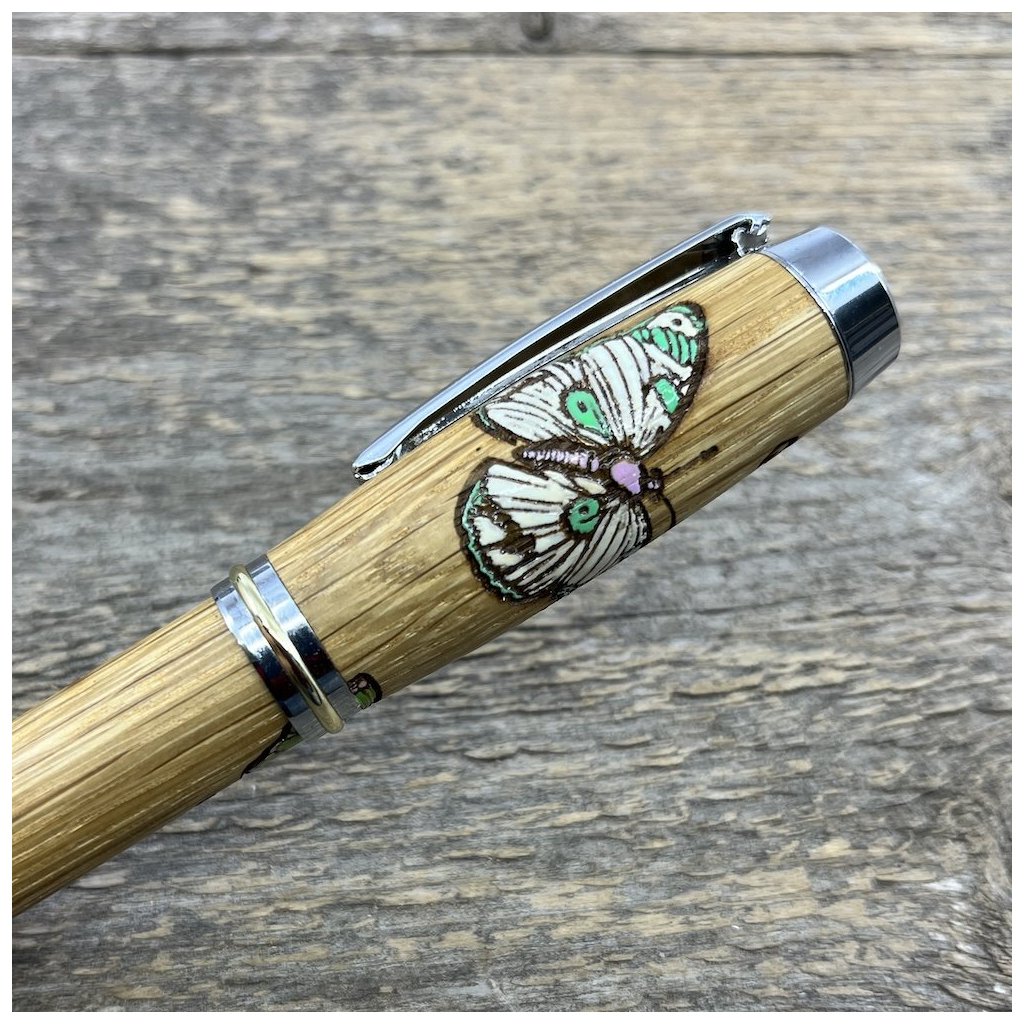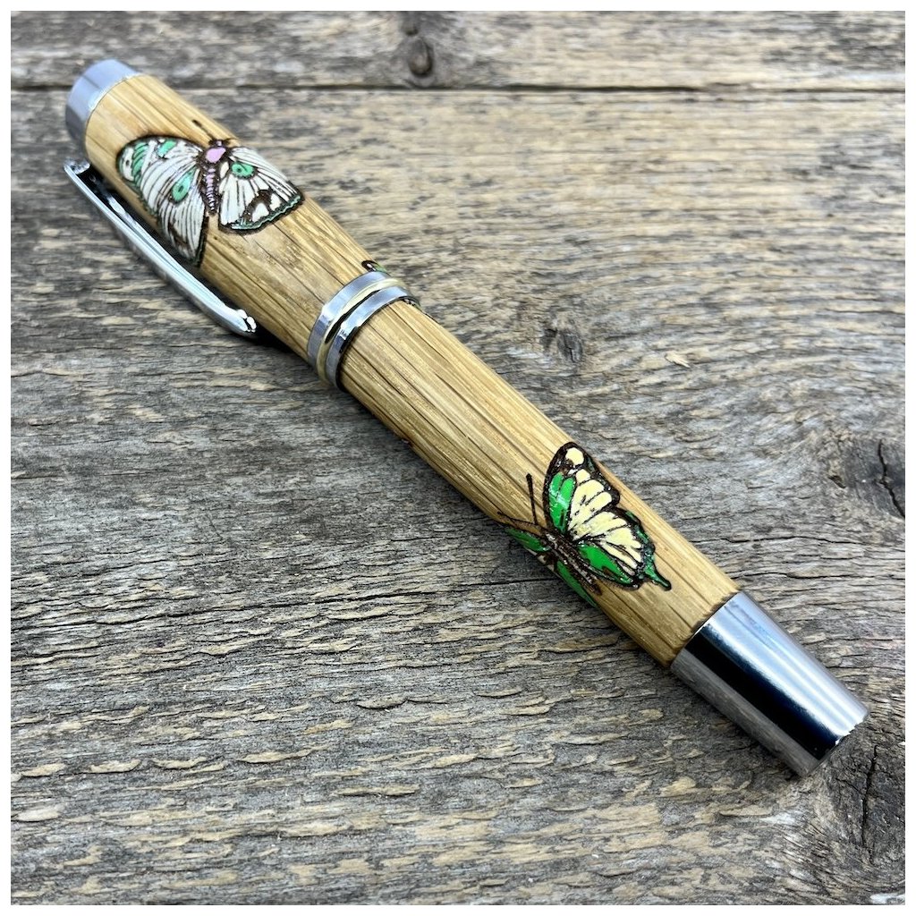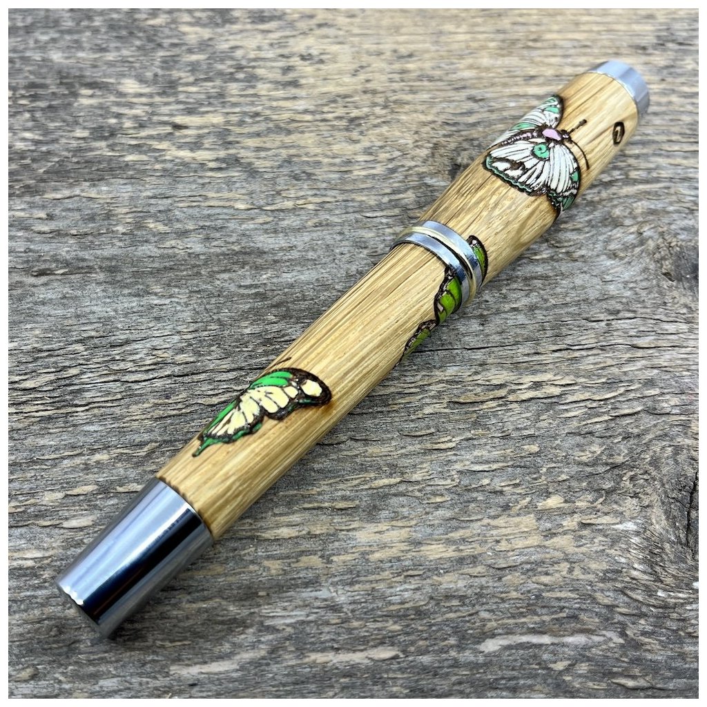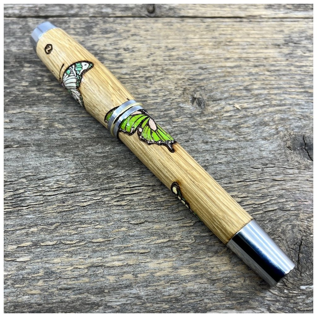 Kuličkové pero Portland L z českého dubu jsem vytvořil pro větší ruce nebo pro milovníky těžších a mohutnějších psacích per.Tentokrát jsem ho doplnil ručně barvenými motýlky, kteří jsou překryti vrstvou bezbarvého laku aby hezky vydrželi.