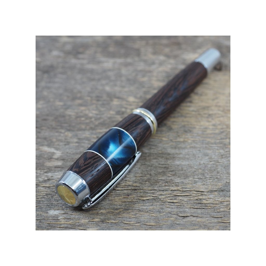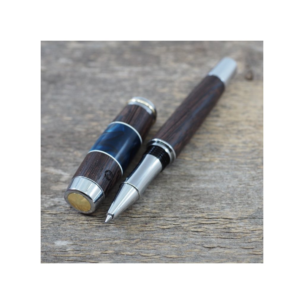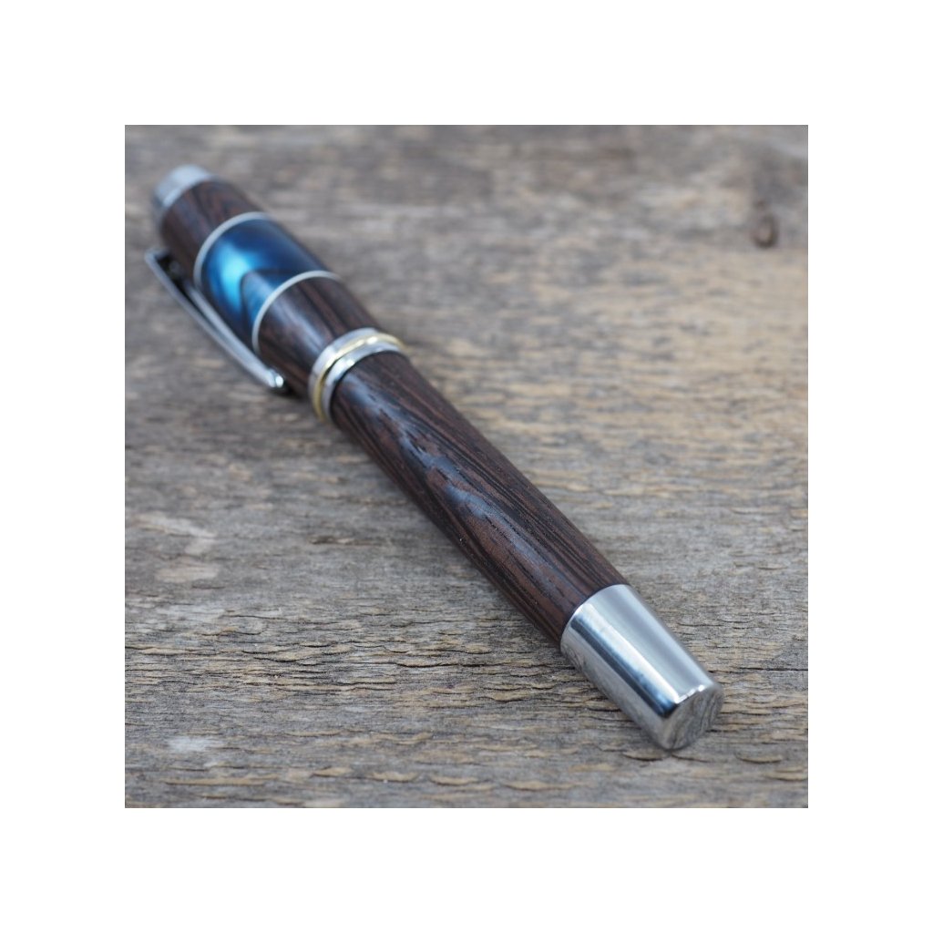 Kuličkové pero Portland L z exotického dřevaWenge a modrého akrylu jsem vytvořil pro větší ruce nebo pro milovníky těžších a mohutnějších psacích perDo pera se vkládají běžné náplně, a aby bylo pero skutečným originálem, můžete si na něj nechat vygravírovat vzkaz, monogram, významné datum, jméno nebo přezdívku, logo firmy a mnohé další. Inspiraci najdete v ukázkách gravírování.