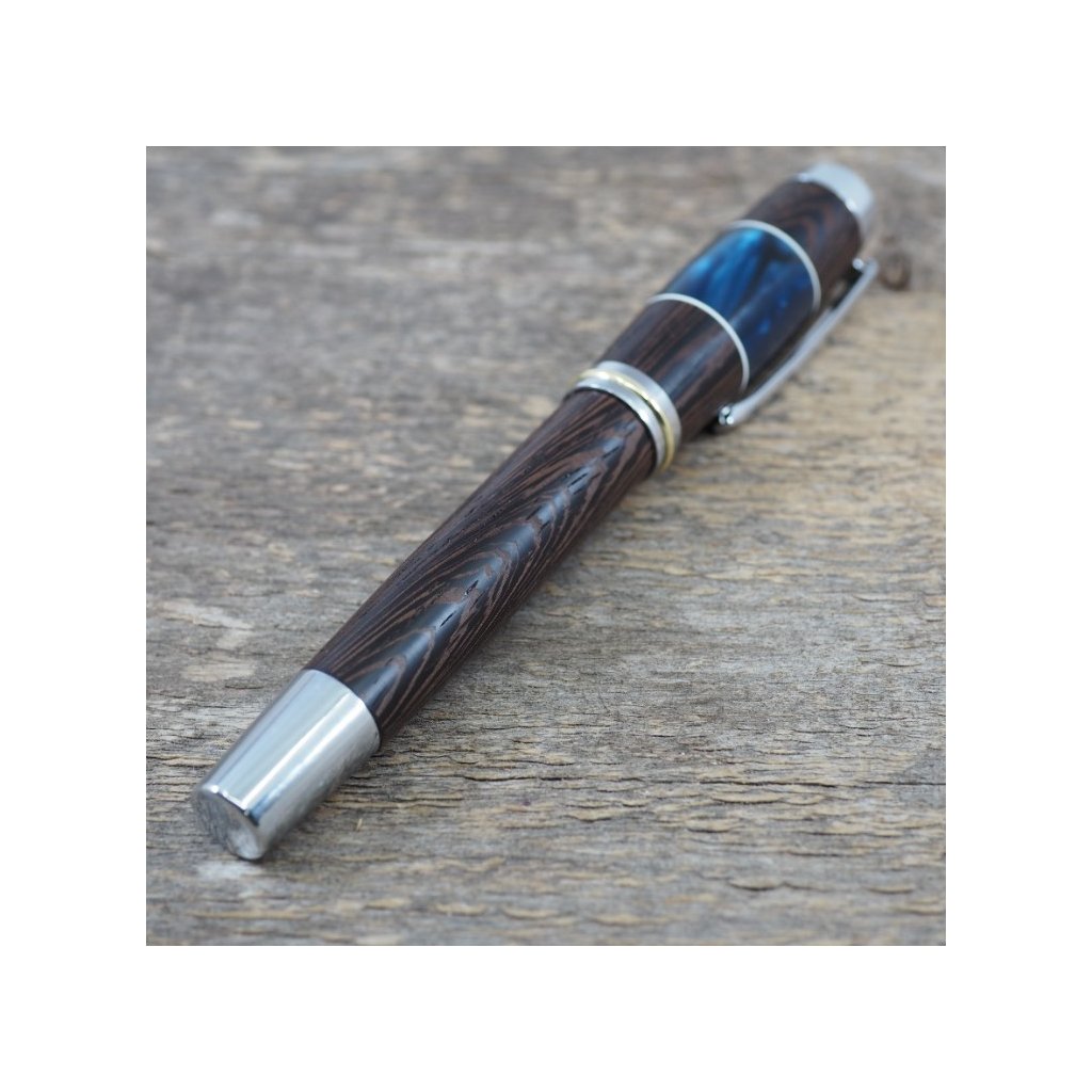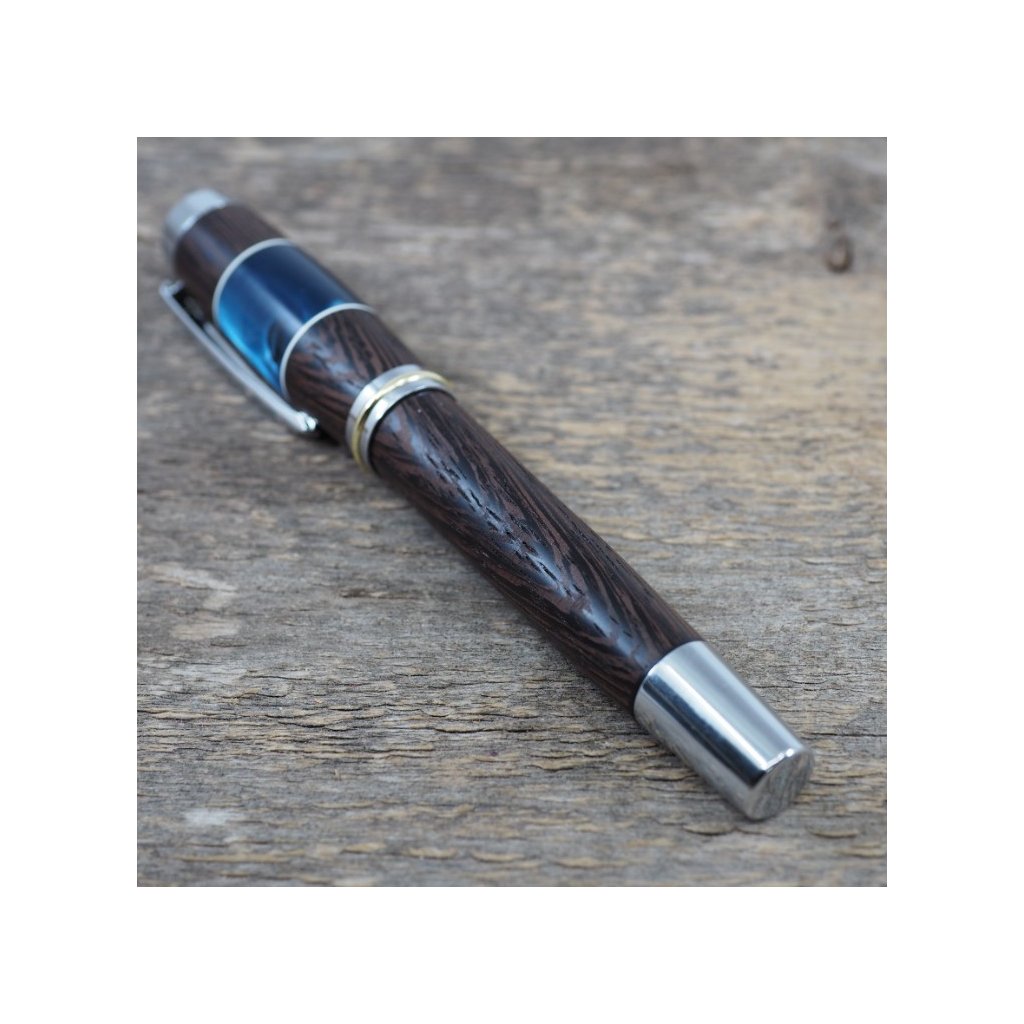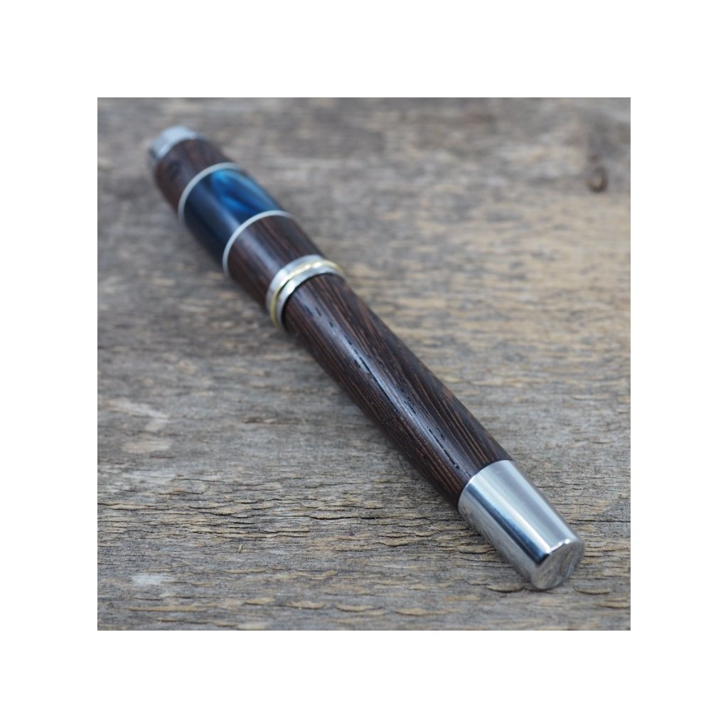 Luxusní ručně vyrobené plnicí pero Portland L z exotického dřeva Wenge v kombinaci s modrým akrylovým proužkem. Víčko pera je šroubovací, takže dobře drží, a kovové komponenty se lesknou stříbrně. Pero se hodí pro psaní poznámek při obchodních jednáních a na schůzkách, ale také pro krasopisné zaznamenávání událostí do deníčků a diářů. Plnicí pero je baleno v luxusní dárkové krabičce s přiloženým certifikátem pravosti