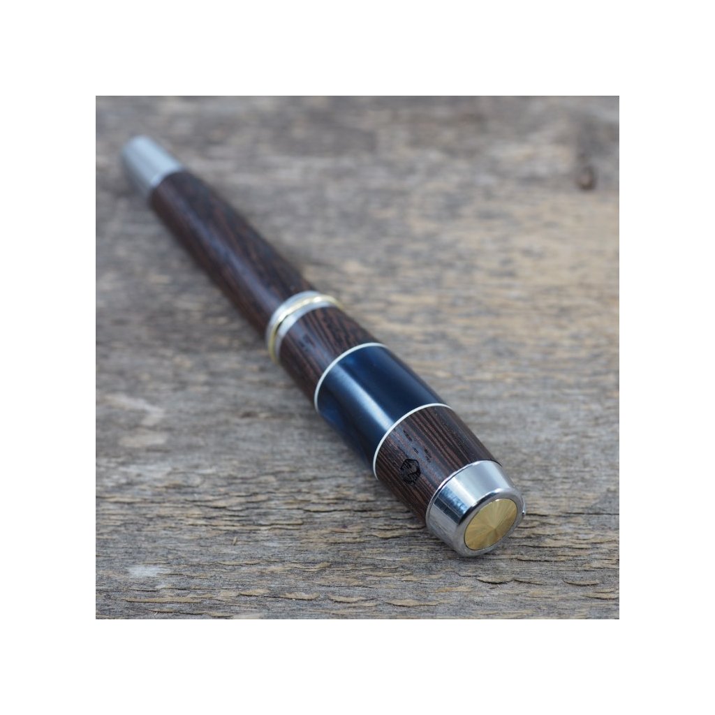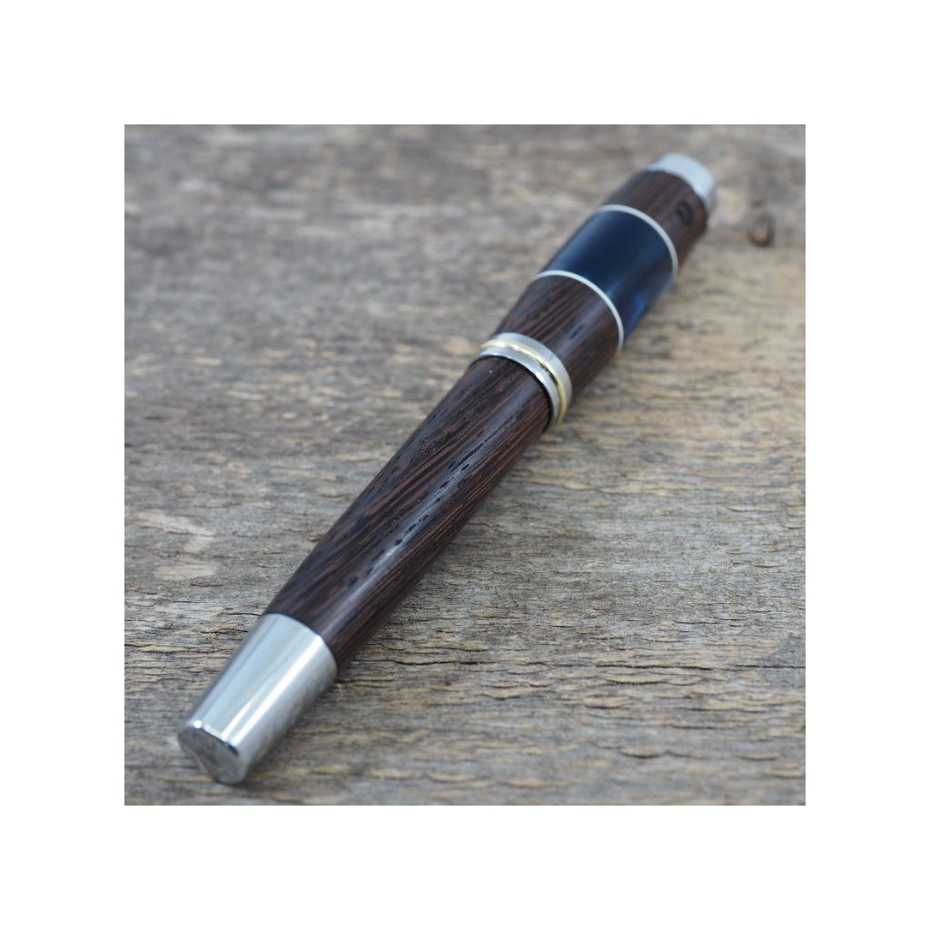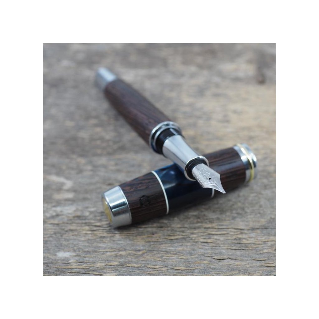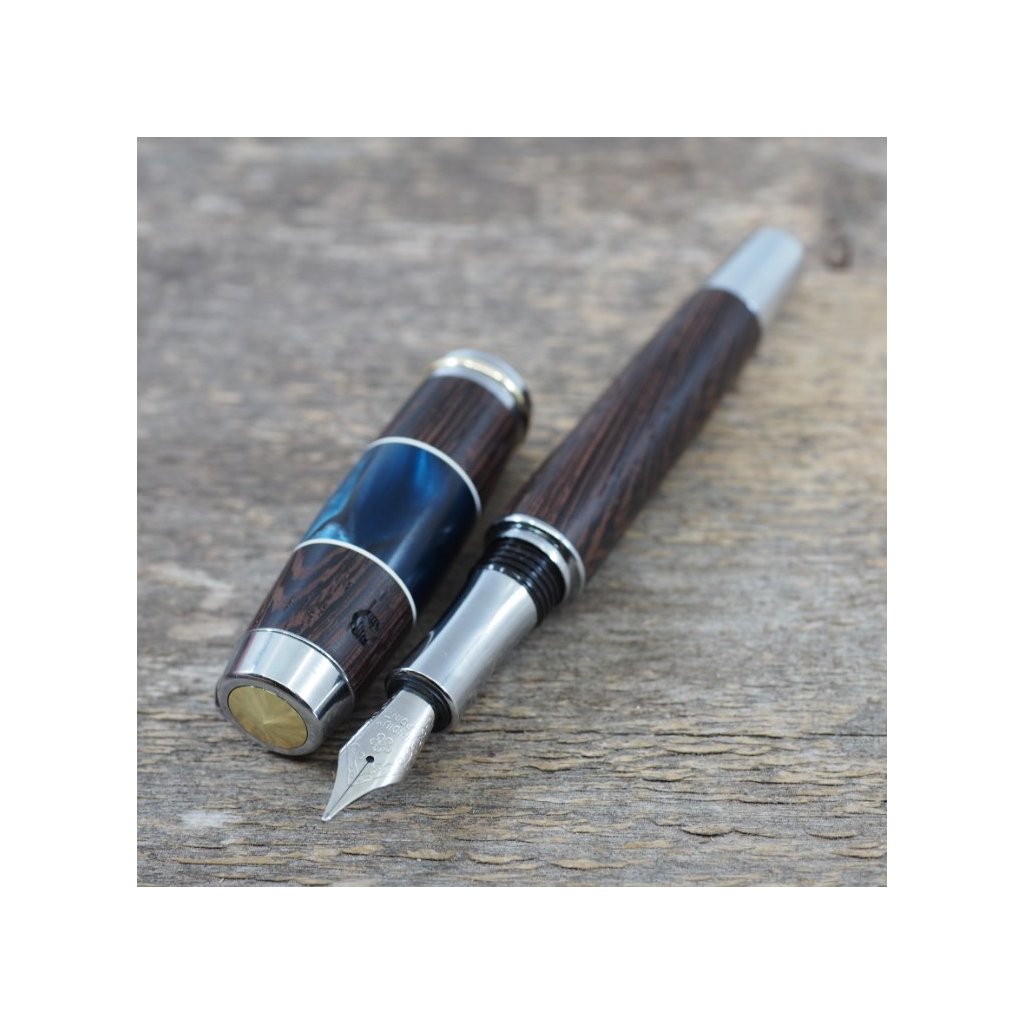 Luxusní ručně vyrobené plnicí pero Portland L z exotického dřeva Wenge v kombinaci s modrým akrylovým proužkem. Víčko pera je šroubovací, takže dobře drží, a kovové komponenty se lesknou stříbrně. Pero se hodí pro psaní poznámek při obchodních jednáních a na schůzkách, ale také pro krasopisné zaznamenávání událostí do deníčků a diářů. Plnicí pero je baleno v luxusní dárkové krabičce s přiloženým certifikátem pravosti