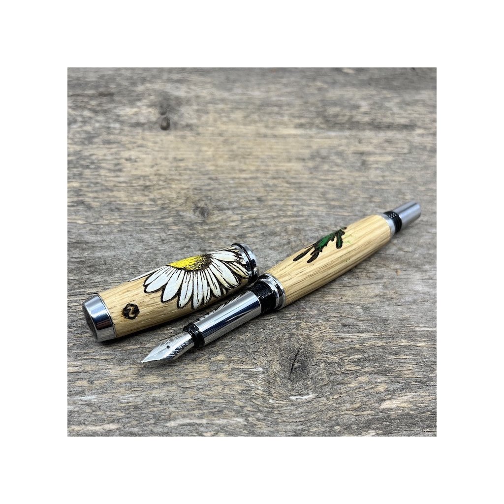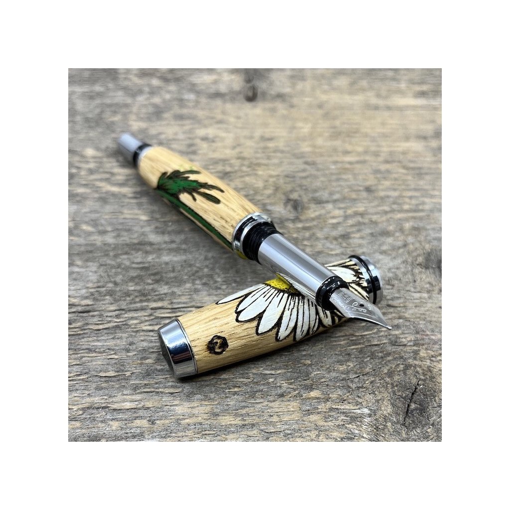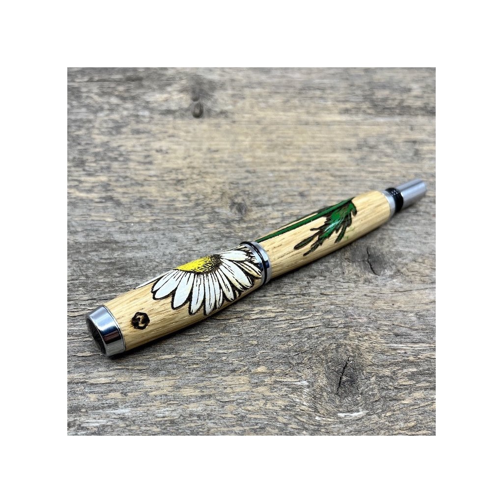 Plnicí pero Portland S z českého dubu jsem vytvořil pro menší ruce nebo pro milovníky lehčích psacích per. Tentokrát jsem ho doplnil ručně barvenou kopretinou, který je překryta vrstvou bezbarvého laku aby hezky vydržel.