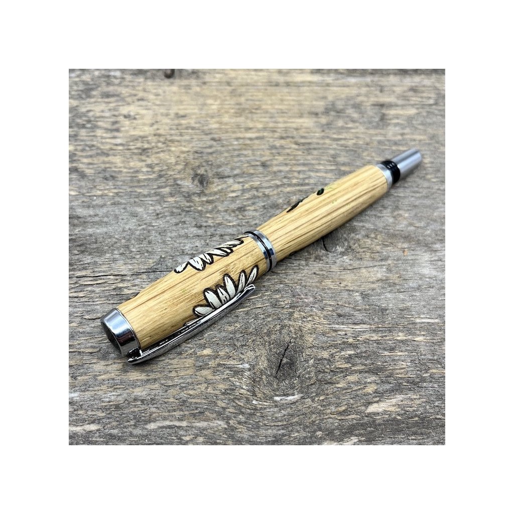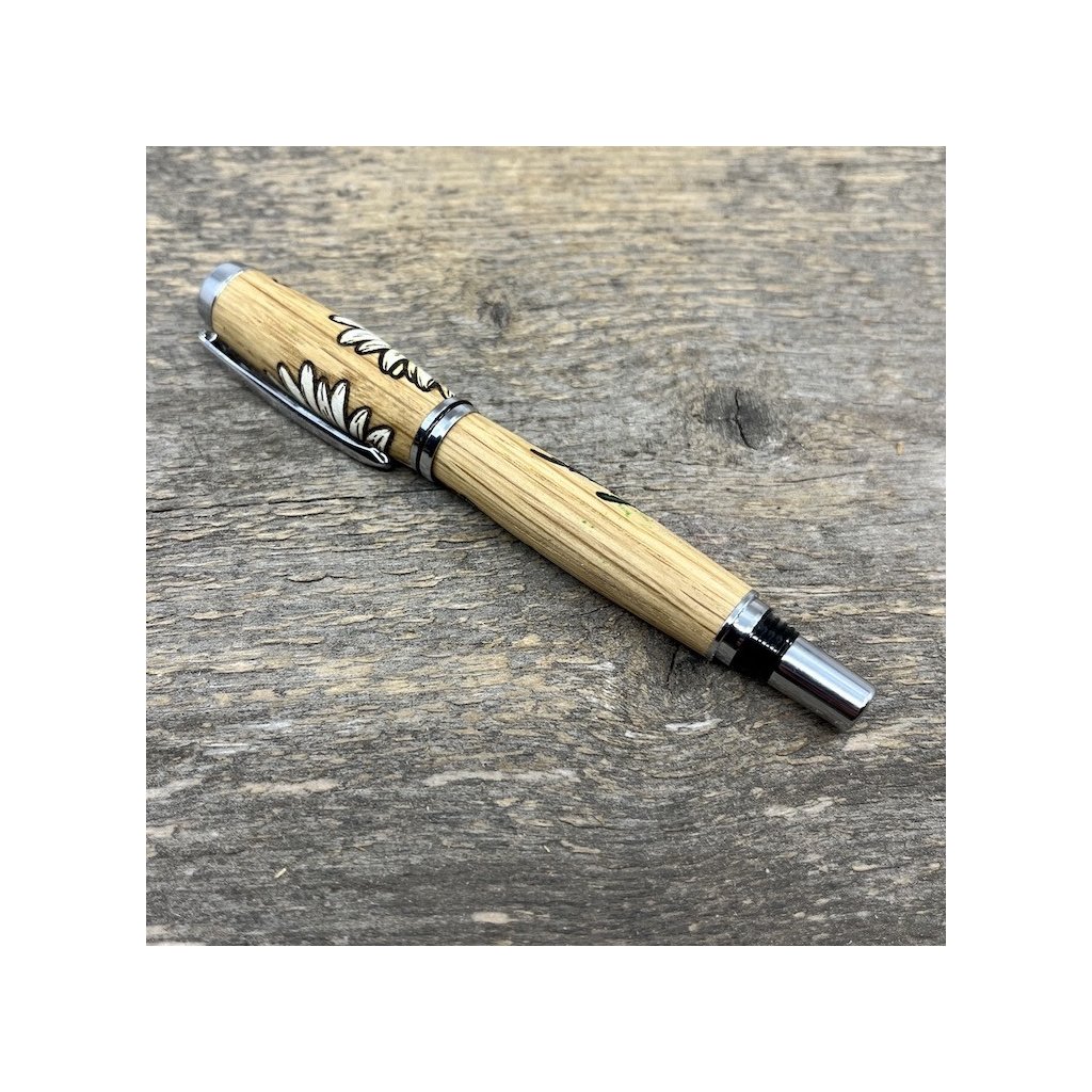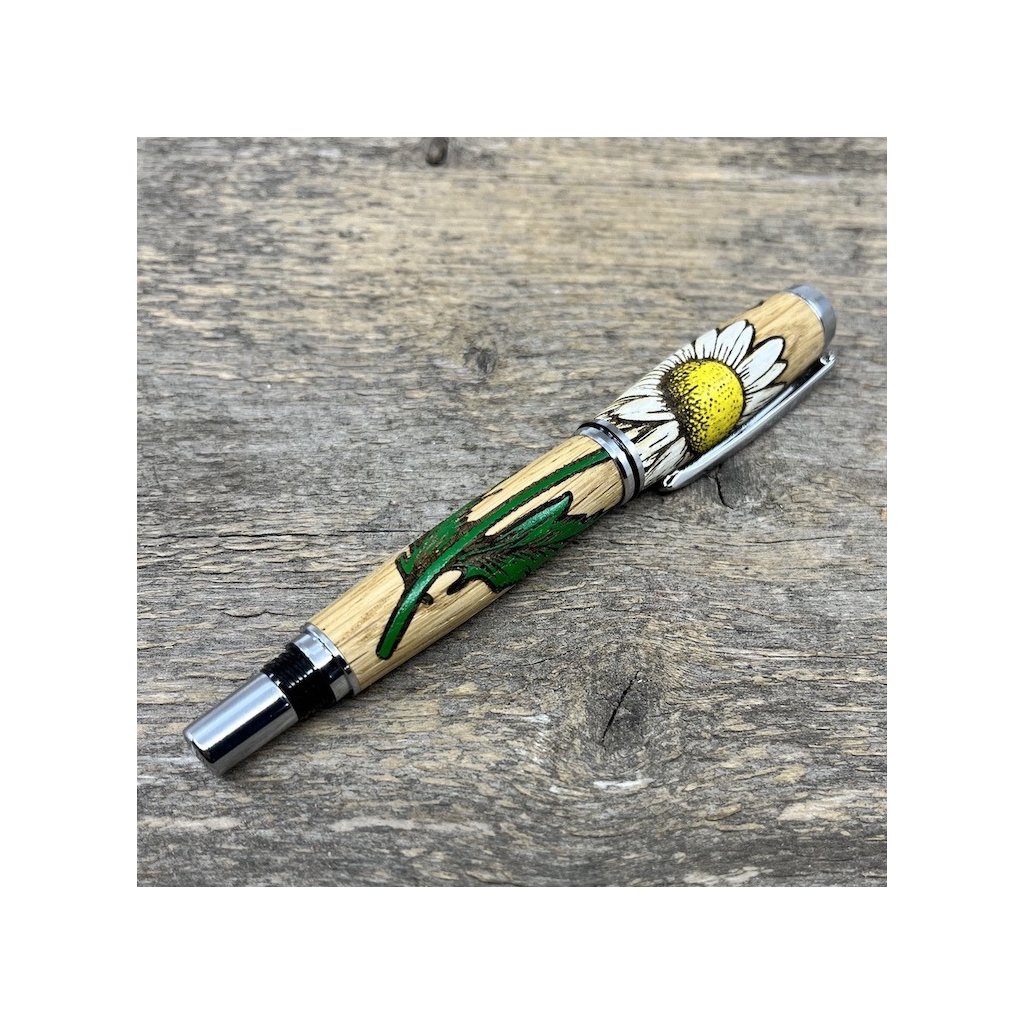 Plnicí pero Portland S z českého dubu jsem vytvořil pro menší ruce nebo pro milovníky lehčích psacích per. Tentokrát jsem ho doplnil ručně barvenou kopretinou, který je překryta vrstvou bezbarvého laku aby hezky vydržel.