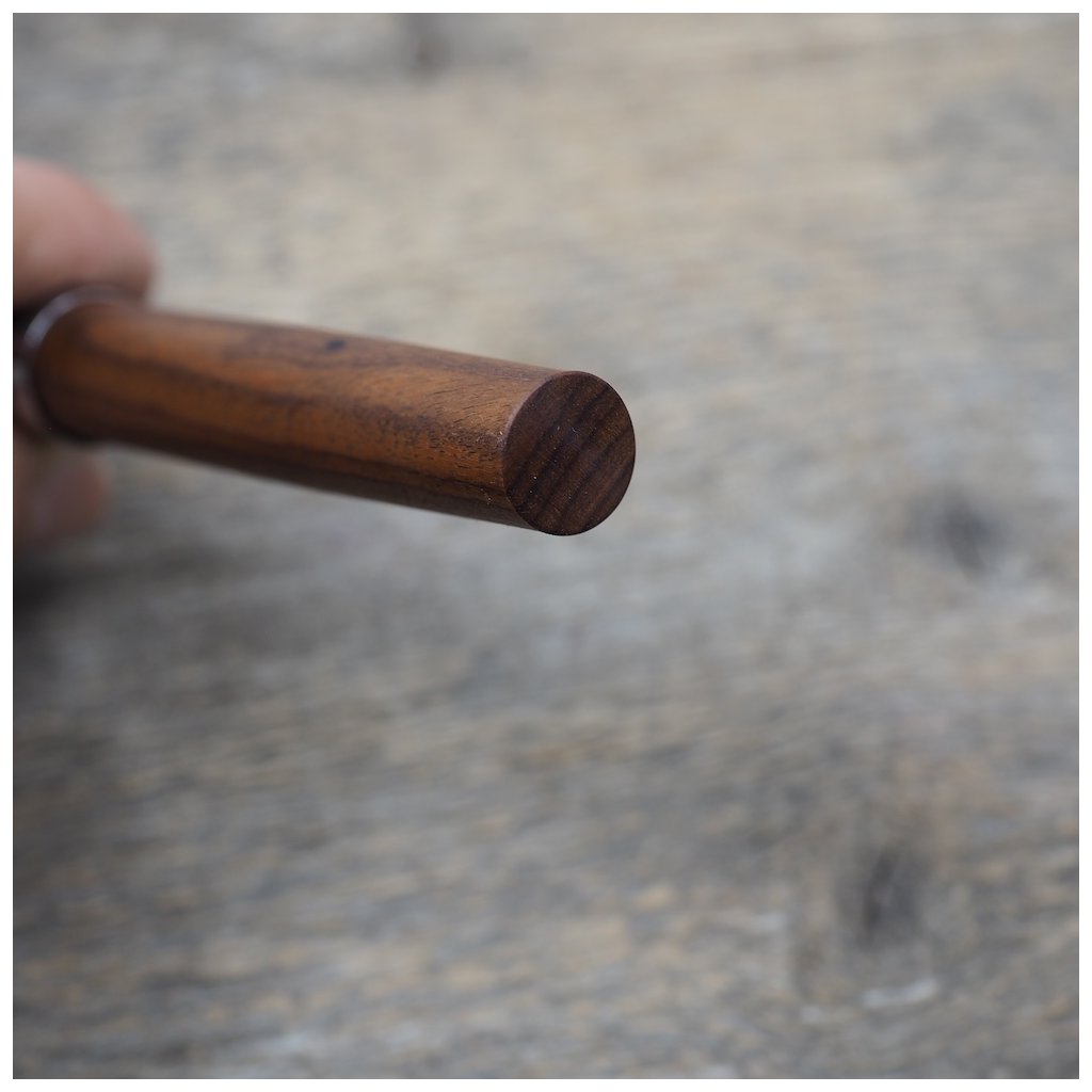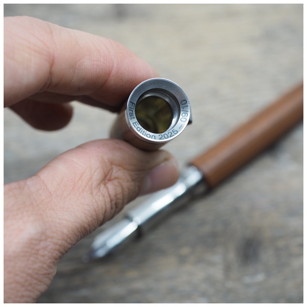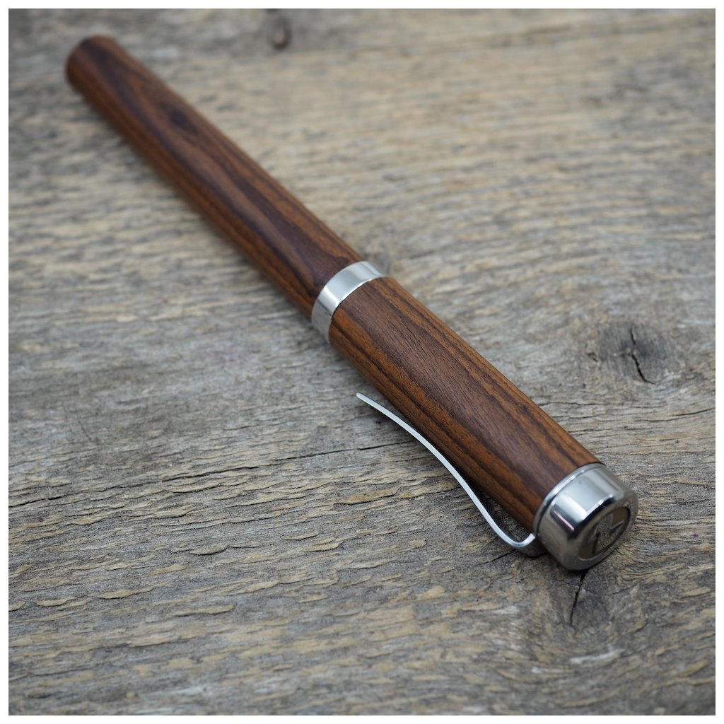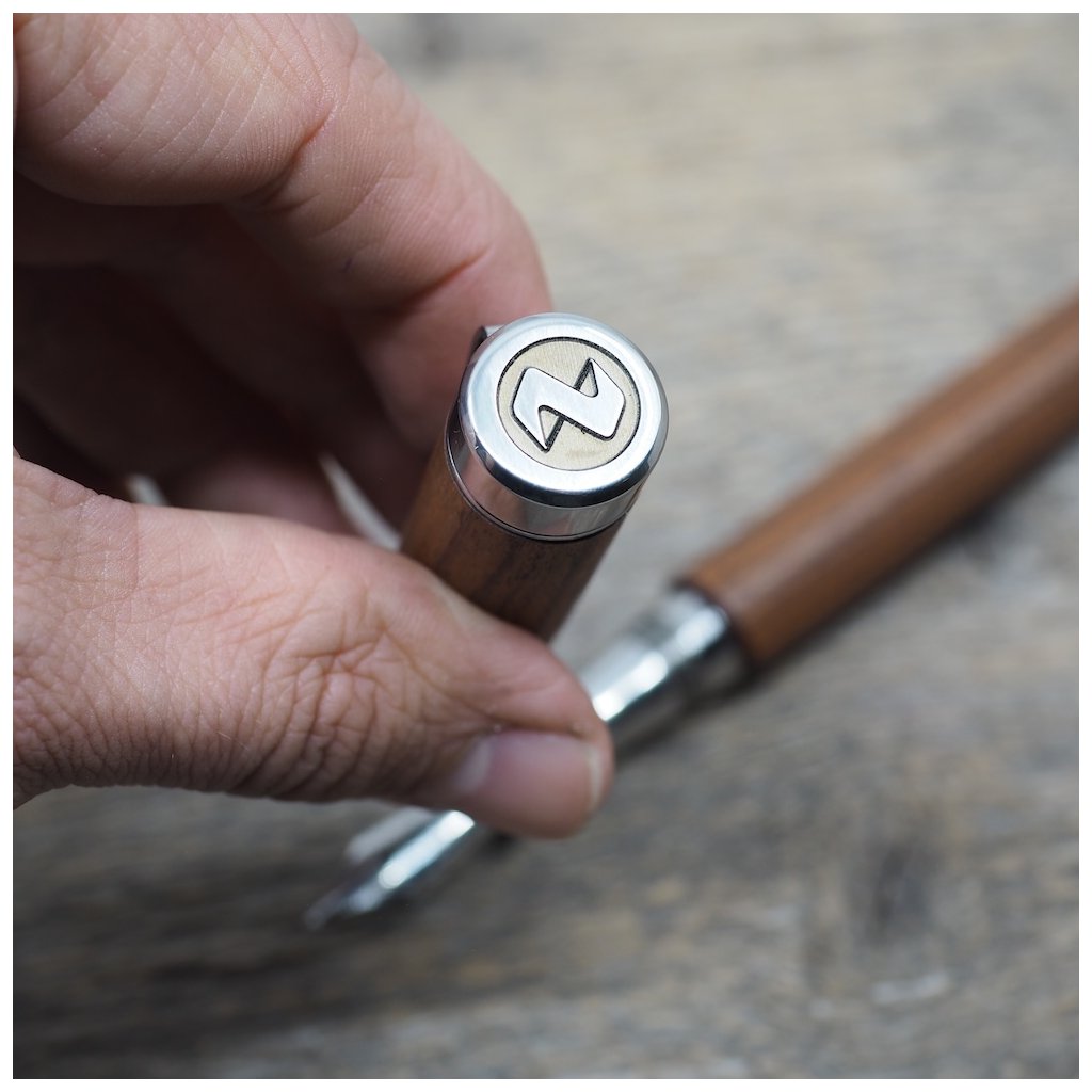 Toto pero je vyvrcholením mých dlouholetých zkušeností s prací se dřevem. Strávil jsem nespočet hodin zdokonalováním svého řemesla a na konečný výsledek jsem velmi hrdý. Úchopová část a všechny závity jsou vyrobeny na zakázku z nerezové oceli, takže vydrží téměř všechno.