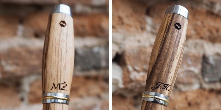 Na každé pero se dá vyrýt osobní věnování, vzkaz, nebo třeba monogram. K tomu mi slouží laserová gravírka. Díky ní mohu na dřevěnou část každého pera přenést téměř jakýkoliv nápis si budete přát. Pro inspiraci, co vše se dá na pero gravírovat, jsem sepsal i krátký text s více než 70 různými nápady. Také se můžete podívat jak vypadá text vygravírovaný přímo na dřevu, které se vám líbí. V této galerii naleznete ukázky většiny materiálů, které používám. Pokud chcete aby bylo gravírování hezky vidět, doporučím spíše světlejší dřeviny jako je Teak, Zebrano, Padouk, nebo třeba Olivu. Na Wenge, Americkém ořechu, nebo třeba bahenním dubu bude věnování decentnější.