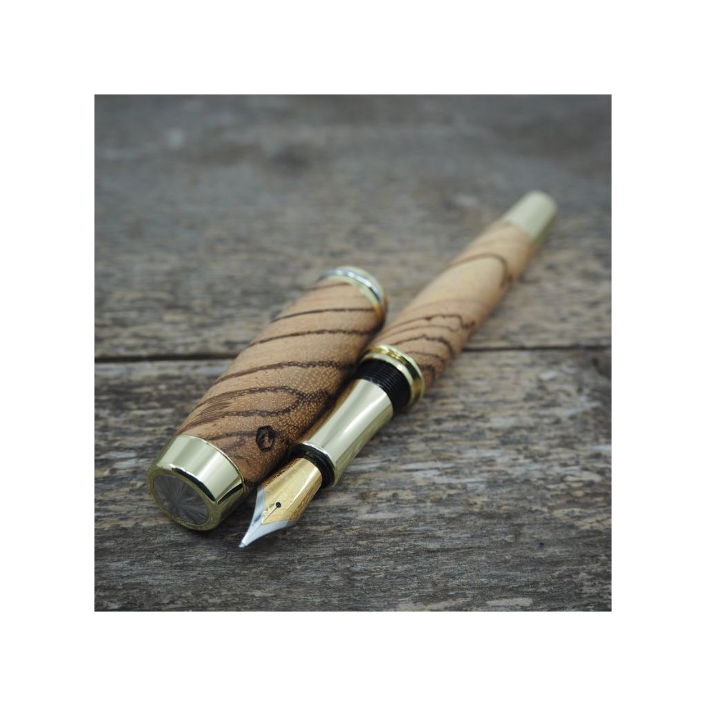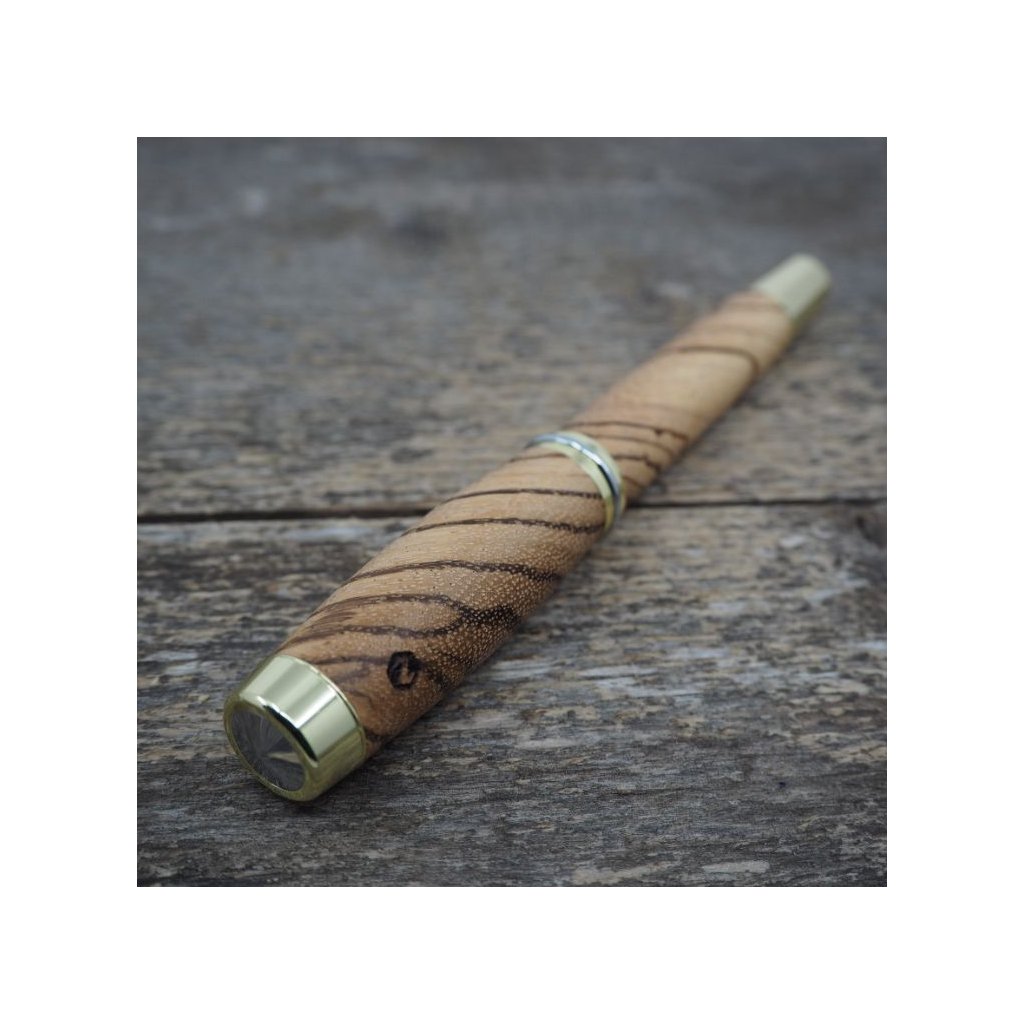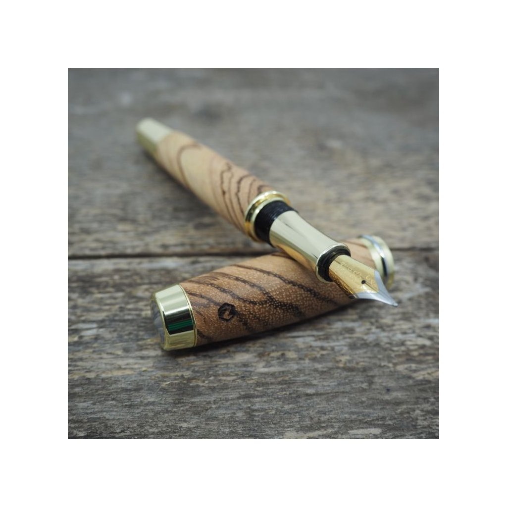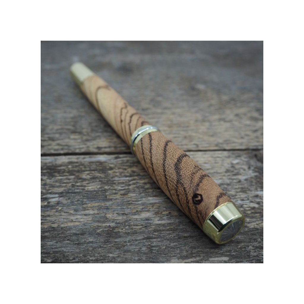 Luxusní ručně vyrobené plnicí pero Portland L. Vyrobené z exotického dřeva Zebrano. Víčko je šroubovací. Kovové komponenty jsou zlaté barvy. Každý kus je originál (kupujete pero, které je na fotkách). Do pera se vkládá klasická náplň dostupná v každém papírnictví.