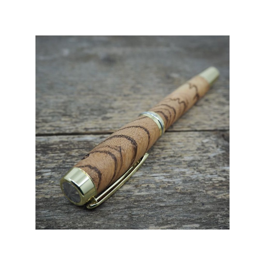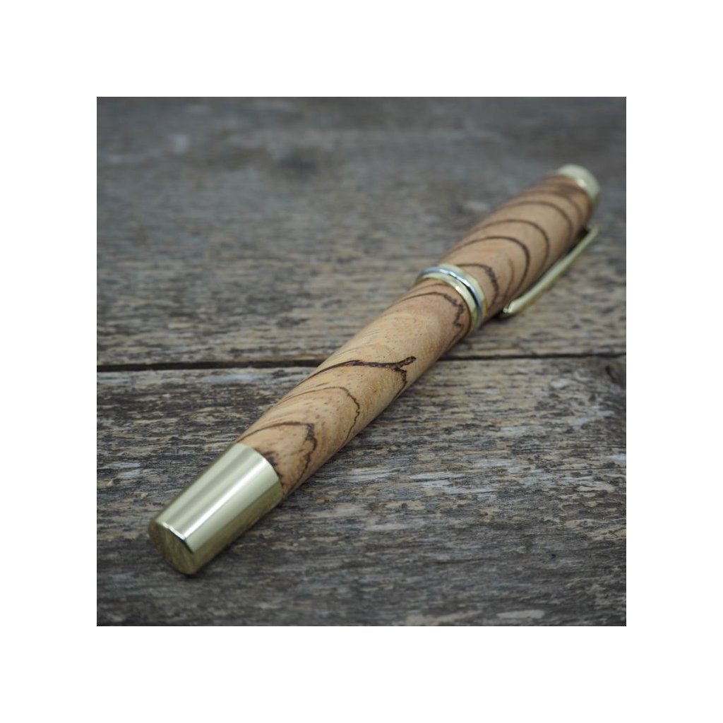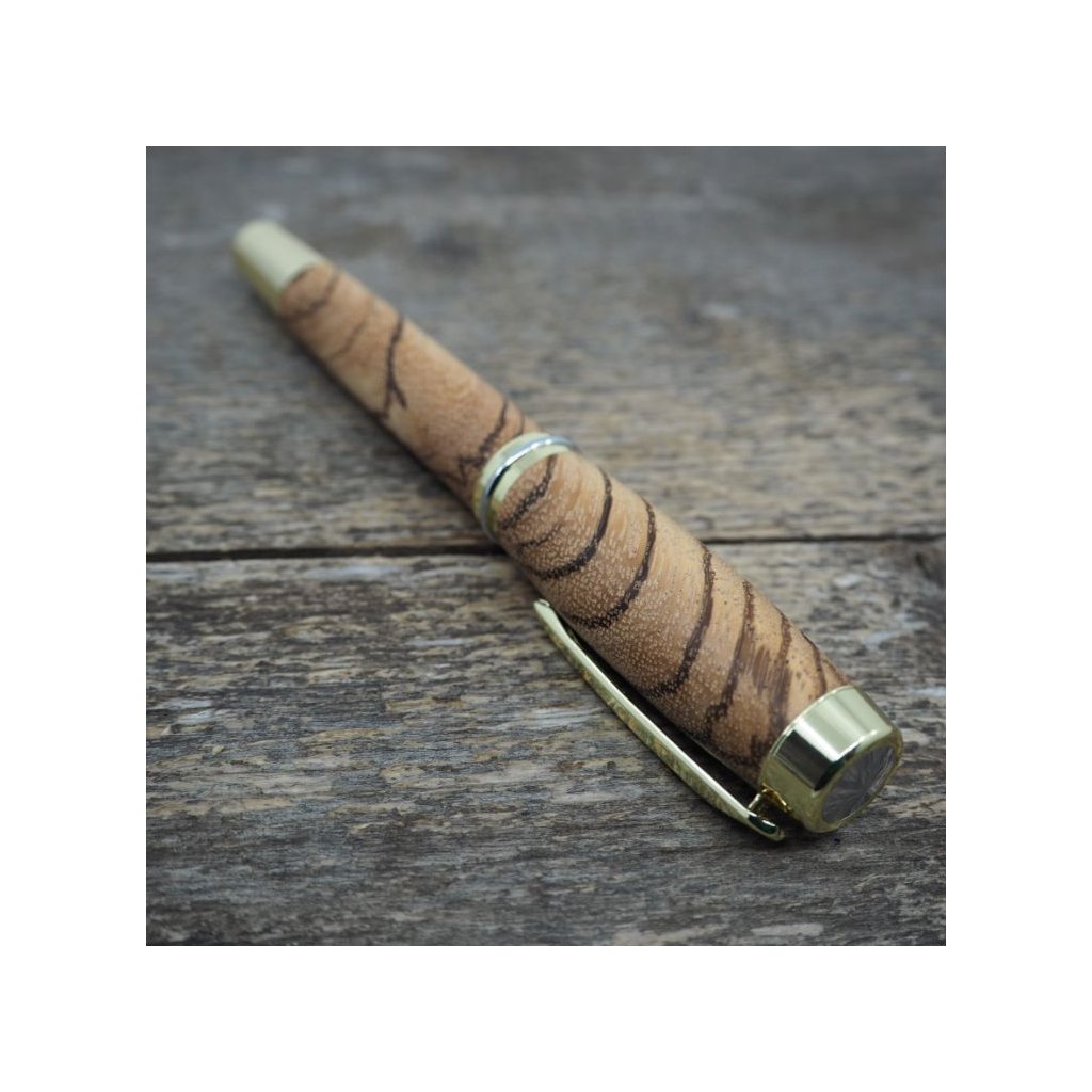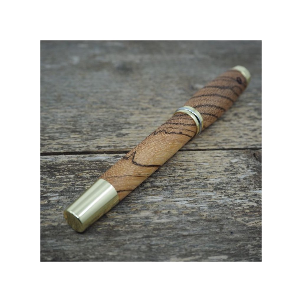 Luxusní ručně vyrobené plnicí pero Portland L. Vyrobené z exotického dřeva Zebrano. Víčko je šroubovací. Kovové komponenty jsou zlaté barvy. Každý kus je originál (kupujete pero, které je na fotkách). Do pera se vkládá klasická náplň dostupná v každém papírnictví.